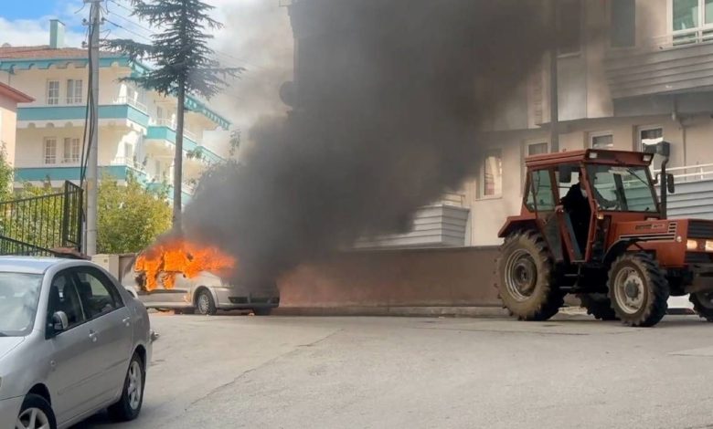 Bu sırada bir genç, otomobilin önünde park halindeki traktörü çalıştırarak yangın bölgesinden uzaklaştırdı.