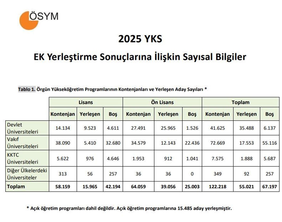 Üniversite sınavı (YKS) ek tercih sonuçları için gözler Ölçme, Seçme ve Yerleştirme Merkezi (ÖSYM) tarafından yapılacak sonuç duyurusuna çevrilmişti. Merakla beklenen sonuçlar açıklandı. İlk tercihlerin ardından bir programa kayıt hakkı kazanamayan veya yerleştiği programa kayıt yaptırmayan öğrenciler, ek tercihler ile birlikte bir kez daha şanslarını denedi. Peki, 2025 YKS ek tercih sonuçları nasıl sorgulanır? İşte ÖSYM sonuç sorgulama ekranı.2025 Yükseköğretim Kurumları Sınavı (YKS) sonuçlarına göre 2025-2026 öğretim yılı için yükseköğretim programlarına ek yerleştirme işlemleri tamamlandı.Adaylar, ek yerleştirme sonuçlarına 6 Ekim 2025 tarihinde saat 16.30’dan itibaren ÖSYM’nin https://sonuc.osym.gov.tr adresinden T.C. kimlik numarası ve aday şifresiyle erişebilecek.YKS EK TERCİH SONUÇLARI İÇİN TIKLAYINEk yerleştirme, ilk yerleştirme sonunda boş kalan kontenjanlara ve kayıt yaptırmayan adayların bıraktığı yerlere öğrenci alınması için düzenleniyor. Bu kapsamda adaylar, en fazla 24 tercih hakkını kullanabiliyor. Sonuçların ilan edilmesiyle birlikte kazanan adaylar, ilgili üniversitelerin duyurduğu tarihlerde üniversite kayıt işlemlerini gerçekleştirecek.Sonuçlar açıklandığında adaylar, ÖSYM’nin resmi sonuç sorgulama sayfası üzerinden T.C. kimlik numarası ve aday şifresi ile sisteme giriş yaparak sonuçlarını görüntüleyebilecek.YKS ek yerleştirme sonuçlarına göre bir programa kayıt hakkı kazanan adayların kayıt işlemleri 10-17 Ekim 2025 tarihleri arasında yapılacak. Elektronik kayıtlar ise 10-12 Ekim 2025 tarihleri arasında yapılabilecek. Kayıt için adayların yerleştirildikleri yükseköğretim programının bağlı bulunduğu üniversiteye süresi içinde başvurmaları gerekiyor.Elektronik kayıt yapan adaylar, üniversiteleri tarafından duyurulan tarihe ve ilgili belgelere göre işlem yapacak.YKS ek tercih sonuçlarının erişime açılmasıyla birlikte sayısal veriler de belli oldu. YKS ek tercihlerde toplam boş kontenjan 122 bin 218 olurken yerleşen aday sayısı 55 bin 21 oldu. YKS ek yerleştirme sonuçlarına göre boş kalan kontenjan sayısı 67 bin 197 oldu. Devlet üniversitelerinde ek yerleştirmeyle toplam 35 bin 488 aday yerleştirildi. Sayısal verilere görsel üzerinden ulaşabilirsiniz.
